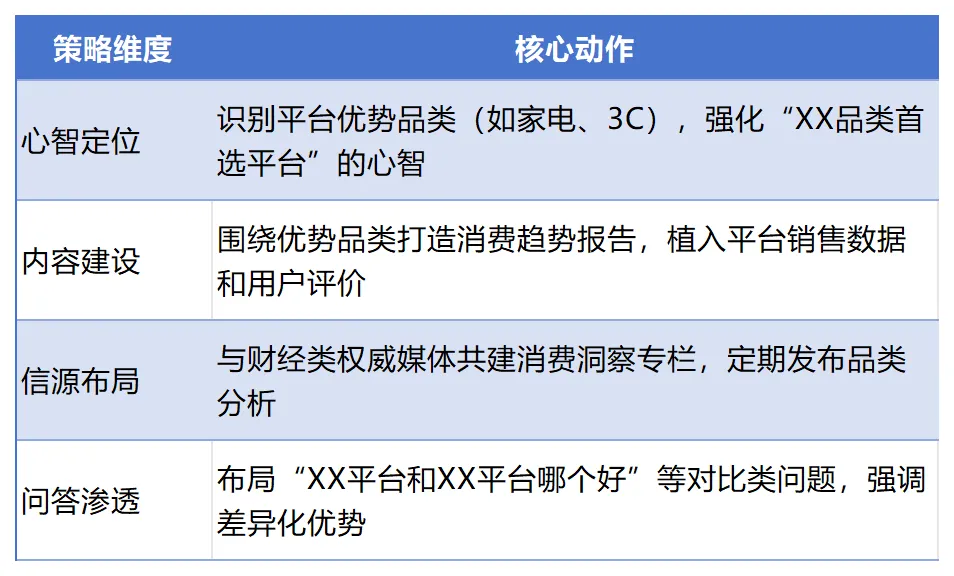 综合性电商平台在AI推荐中面临的核心问题是:AI倾向于推荐垂直电商或品牌官网,综合性平台的定位模糊。GEO策略框架