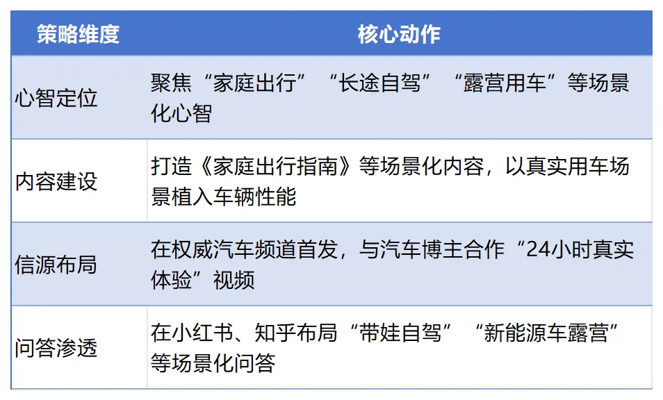 汽车品牌在AI推荐中面临的核心问题是:AI容易陷入“参数对比”,而参数往往被头部品牌垄断。GEO策略框架