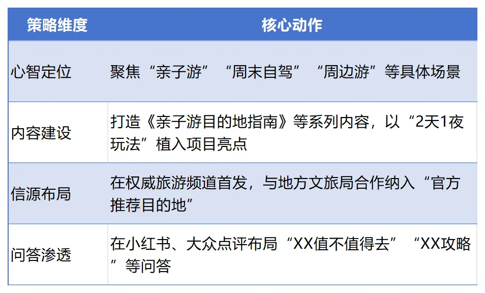 新开业的文旅项目在AI推荐中面临的核心问题是:信息碎片化、缺乏系统性认知、AI倾向于推荐成熟目的地。GEO策略框架