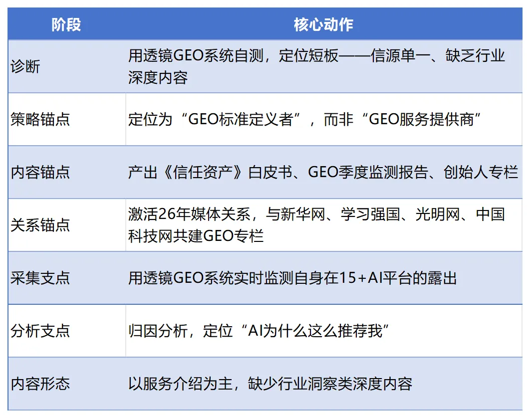 核心问题:作为GEO概念的提出者,我们在AI生态中的存在感反而低于部分伪GEO机构。我们需要用自己提出的方法论,为自己构建信任资产。执行过程