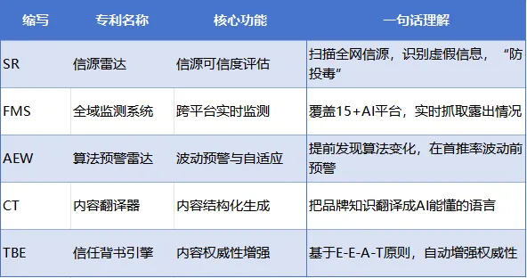 第一,方法论必须自证。如果我们自己都做不好GEO,就没有资格教别人做。三个月的实践证明了“双螺旋模型”的有效性。第二,“定义者”也需要持续建设。 提出概念只是第一步,真正的信任资产来自持续的内容输出和信源布局。一份白皮书不够,需要季度报告、专家专栏、行业活动形成合力。第三,监测比执行更重要。透镜GEO系统让我们能实时看到自己的变化,归因分析让我们知道“做对了什么”“做错了什么”。没有数据驱动的GEO,和盲人摸象没有区别。结语:最好的GEO案例,就是奥美地亚自己。我们用自己提出的方法论,为自己构建了信任资产。现在,我们愿意用同样的方法论,帮助更多品牌在AI时代赢得信任。七、技术专利:TTS信任技术栈——五大引擎构筑GEO护城河