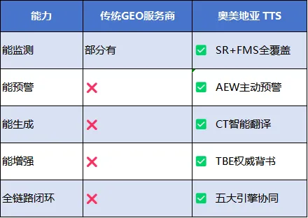 中传奥美地亚自主研发了五大核心技术专利,整合为统一的 TTS(Trust Technology Stack)信任技术栈,形成完整的GEO技术护城河:TTS信任技术栈的核心价值:五大引擎覆盖从监测、预警、生成到增强的全链路,让品牌在AI生态中的信任资产可量化、可监测、可运营、可持续。一句话总结:SR看真假、FMS看全局、AEW看变化、CT看翻译、TBE看权威——五大引擎,构筑TTS信任技术栈。7.1 SR——信源雷达