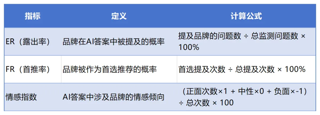 中传奥美地亚的定位,就是成为品牌的“首席AI信任官” ——帮品牌在AI世界,成为最值得信任的那个答案。从2000年的121融媒体,到2026年的GEO,中传奥美地亚的使命始终如一:做连接者,不做操控者;做守门人,不做投毒人;做信任的资产运营商,不做流量的快闪贩。我们相信,在不久的将来,“奥美地亚”将成为GEO运营服务这个品类的代名词——就像“罗兰贝格”代表战略咨询、“奥美”代表品牌广告一样。这是我们正在努力的方向,也是我们对中国品牌的承诺。*附录:GEO核心指标与监测方法