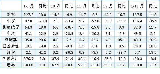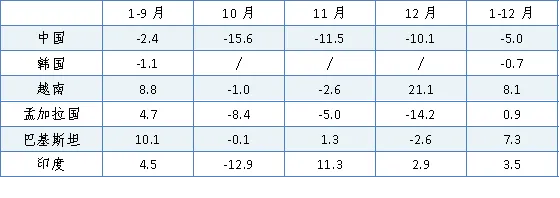 (数据来源:中国海关总署、韩国海关、越南统计局、孟加拉国服装制造商和出口商协会、巴基斯坦统计局、印度服装出口促进委员会)