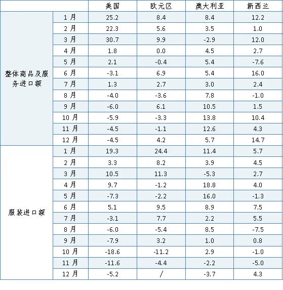 表2 2025年各月各国服装进口增速(单位:%)