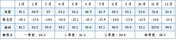 (数据来源:Trading Economics﹔注:美国:基准为1966年一季度,数值= 100。欧元区:指数区间为-100~100,-100为极度缺乏信心,0为中立,100为极端信心。澳洲、新西兰:指数>100为乐观居多,<100为悲观居多。)
