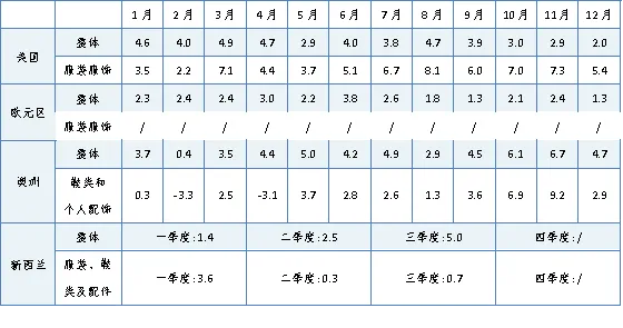 2025年,美国服装服饰店零售额同比增长5.6%,增速比1-9月加快0.3个百分点;澳大利亚服装、鞋类和配饰零售同比增长2.7%,其中四季度同比增长5.8%;三季度,新西兰服装鞋类和配饰零售同比增长0.7%。