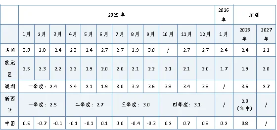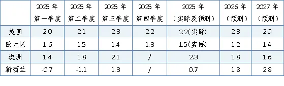 预计2026年美国、新西兰宏观经济增速加快,澳大利亚及欧元区增速放缓。