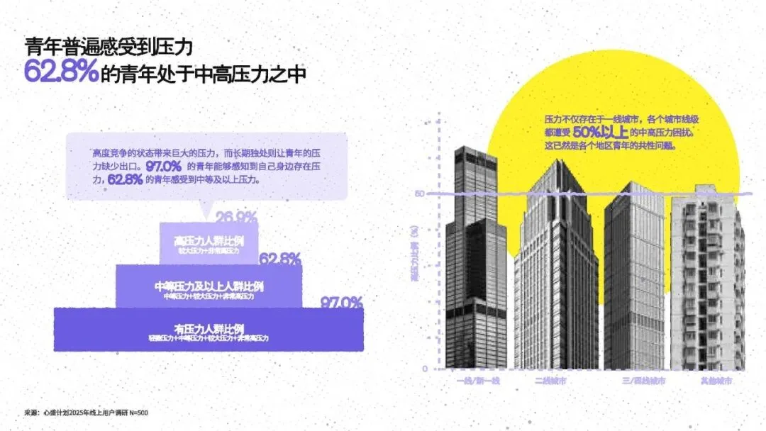97% 的青年能感知到自己身边存在压力,62.8% 的青年正处在中等及以上的压力之中。这个数字不是一线城市的专属标签,二线三线四线乃至其他城市的青年,都有超过半数的人被中高压力困扰。压力成了各个地区青年身上共通的时代印记。