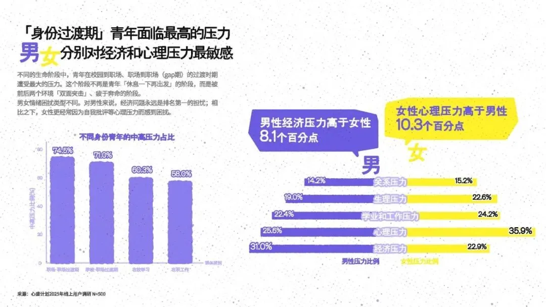 不同生命阶段里,处在在校到职场职场到职场过渡期的青年,承受着最高的压力。这个本该可以稍作喘息的阶段,成了被前后两个环境双面夹击的时刻,年轻人在身份转换的夹缝里疲于奔命。男女之间的情绪困扰,也呈现出清晰的分野。对男性来说,经济问题永远是排名第一的担忧,他们的经济压力比例比女性高出 8.1 个百分点。而女性更常陷入自我批评带来的心理压力,她们的心理压力占比,比男性高出 10.3 个百分点。