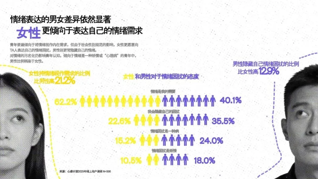 男女在情绪表达上的差异依然显著。社会性别规范的影响下,女性更愿意向他人表达自己的情绪困扰,也更愿意接纳情绪的存在。女性将情绪视作自身需求的比例,比男性高出 21.2%。而男性更常隐藏自己的情绪,他们隐藏情绪困扰的比例,比女性高出 12.9%。即便是对情绪的污名化认知,也存在着性别差异,倾向于认为情绪是矫情或心理病的青年中,男性的比例要稍高于女性。