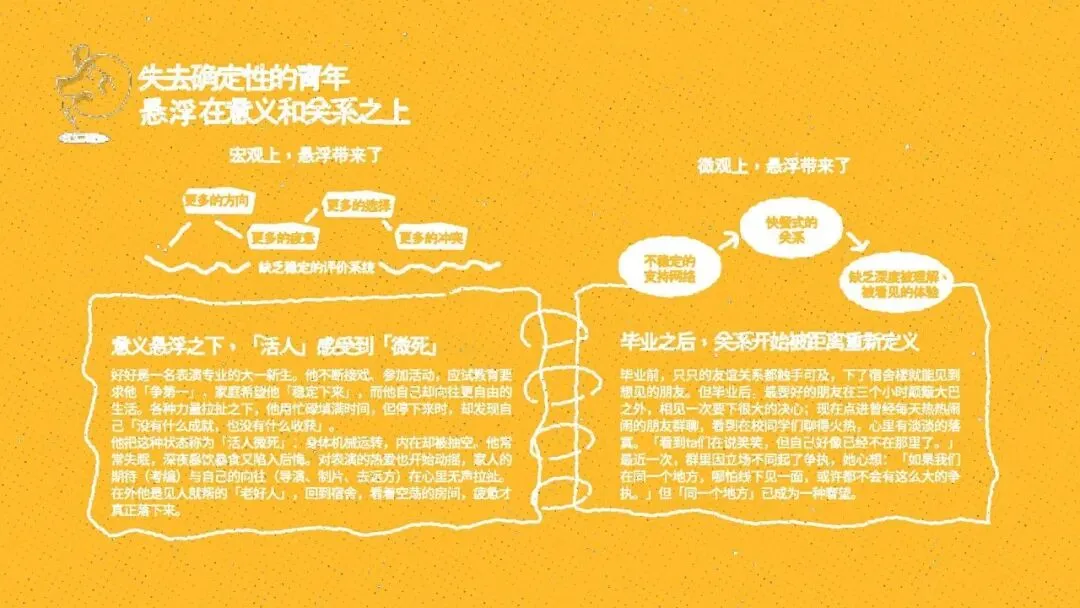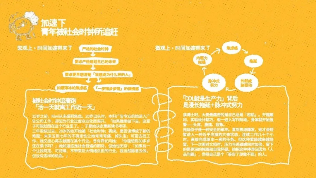 原生家庭教育系统职场环境数字媒介,这四个维度共同塑造了青年的情绪底色。他们的时间意识被不断拉扯,人生的节奏在加速,可想要的结果却在延后。社会时钟像一把悬在头顶的尺子,逼着他们在固定的年龄完成固定的人生节点,一步错步步错的焦虑,刻进了很多人的日常。他们被要求早早地想清楚自己要去哪里,要成为什么样的人,却没有足够的时间去试错,去探索。很多人陷入了漫长拖延加脉冲式努力的循环,DDL 就是生产力的背后,是一次又一次的情绪耗竭和自我怀疑。