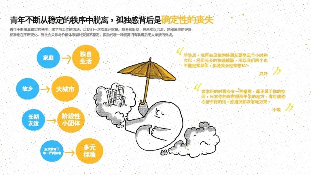 这一代青年的成长轨迹,几乎和独生子女政策商品房大潮高等教育普及智能手机普及经济增速放缓这些节点严丝合缝地重合。他们在封闭的小区里长大,在自己的房间里度过大部分青春期,习惯独处,也常常被动处在一个人在房间吃外卖的状态。智能手机和互联网从青春期就渗透进他们的生活,网络社交挤压了现实社交的时间,Z 世代青年每周和朋友出门的时间,比上一代人整整缩短了一天。