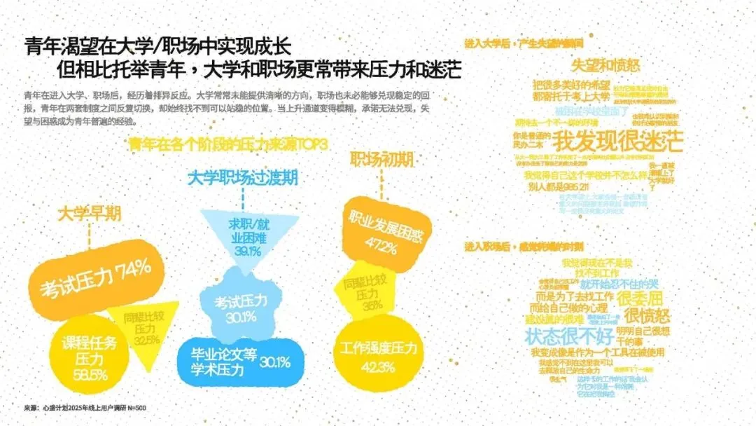 青年们的压力从来都不是单一的。数据显示,青年平均每人要面对 48 个不同的压力源,这些压力渗透在学习工作心理感受生理状态亲密关系经济状况的每一个角落。排在第一位的压力来源,是对未来感到不确定,缺乏掌控感,有 41.9% 的青年被这种感受困住。然后是对现状不满,没有达成自己的期待。考试压力大竞争激烈排在第三位。