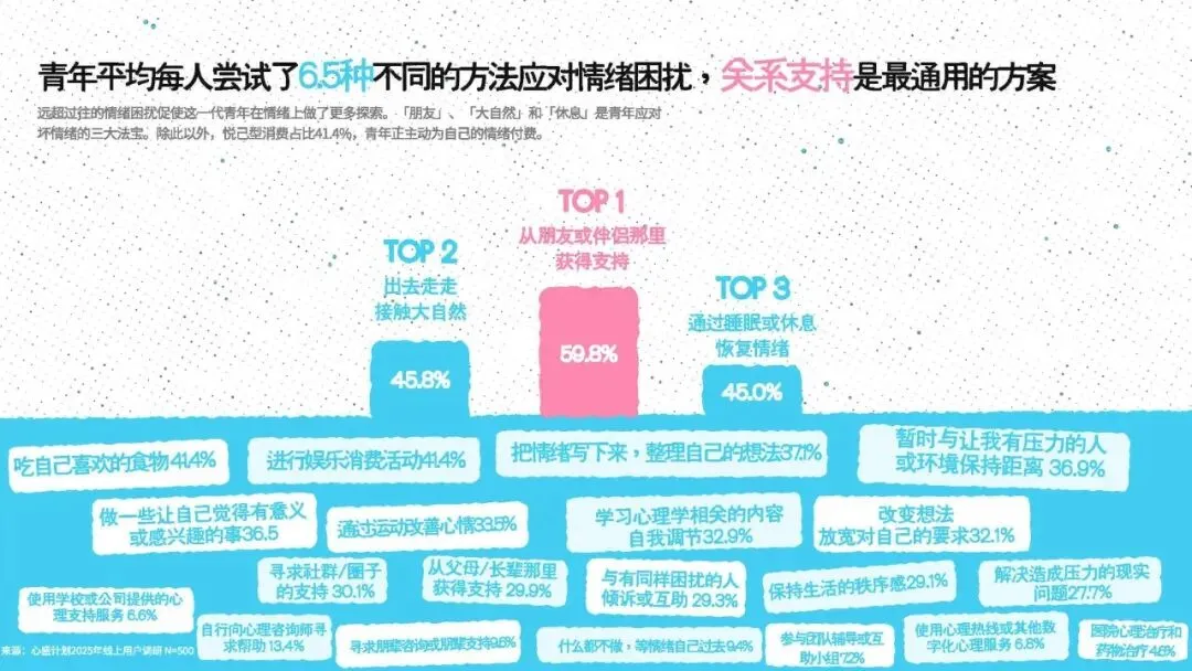 面对无处不在的情绪困扰,这一代青年没有坐以待毙。他们平均每人尝试了 6.5 种不同的方法,来应对情绪困扰。朋友大自然休息,是他们对抗坏情绪的三大法宝。排在第一位的应对方式,是从朋友或伴侣那里获得支持。其次是出去走走接触大自然,占比 45.8%。排在第三位的,是通过睡眠或休息恢复情绪,占比 45.0%。44% 的人会选择吃自己喜欢的食物,41.4% 的人会进行娱乐消费活动,主动为自己的情绪付费。37.1% 的人会把情绪写下来,整理自己的想法,36.9% 的人会暂时和让自己有压力的人或环境保持距离,33.5% 的人会通过运动改善心情,32.9% 的人会学习心理学相关的内容进行自我调节。