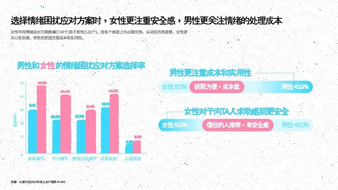男女在应对方式的选择上,也有着明显的差异。女性平均尝试的情绪应对方案有 7.44 个,远高于男性的 5.02 个,在几乎所有的应对维度上,女性的尝试比例都要更高。从选择的动机来看,女性更在意方案带来的安全感,61.8% 的女性会更愿意选择信任的人推荐的,有安全感的方式。而男性则更注重成本和实用性,43.9% 的男性会优先选择获取方便,成本低的方式。