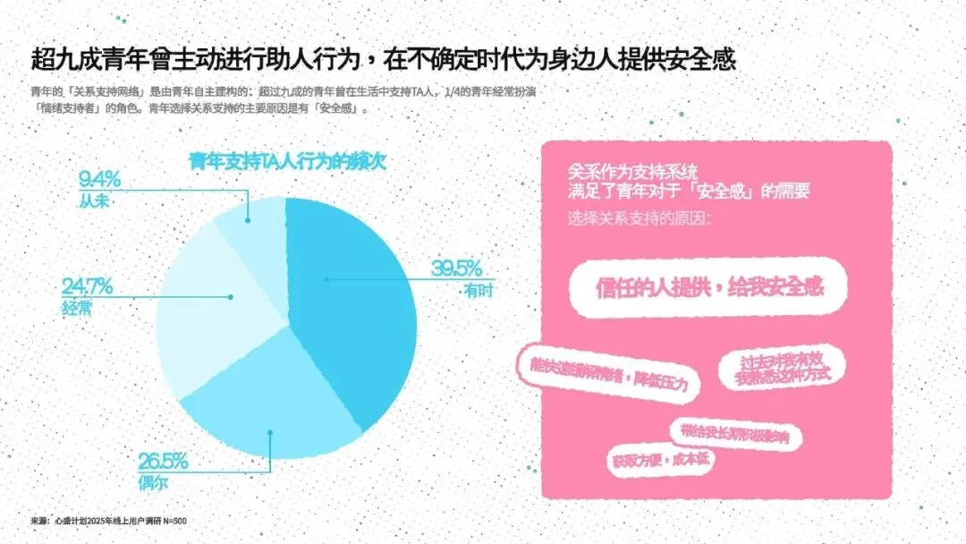 但这并不意味着青年们只懂得被动接受情绪。超过九成的青年,都曾在生活中主动支持过身边有情绪困扰的人。24.7% 的青年,经常在关系里扮演情绪支持者的角色。他们自主建构起了一张关系支持网络,在不确定的时代里,为彼此提供着安全感。他们也在压力之下,发展出了多元的生命力补给方案。
