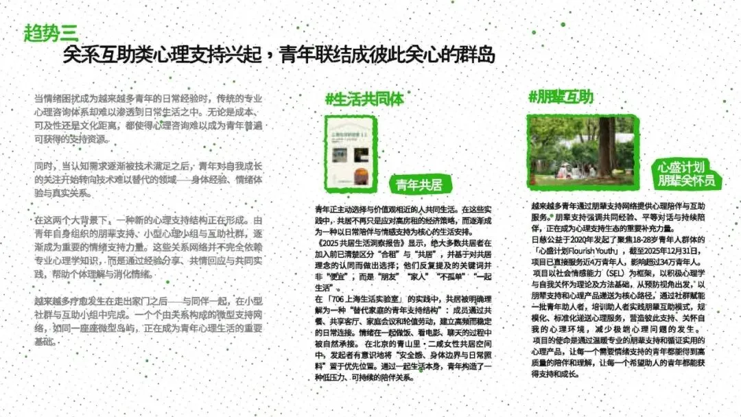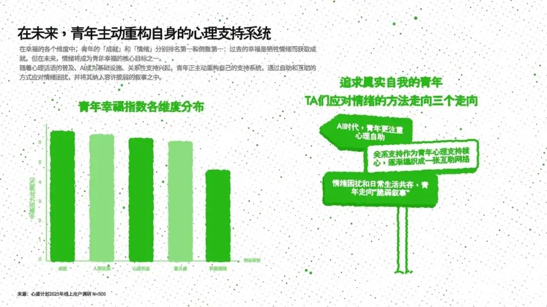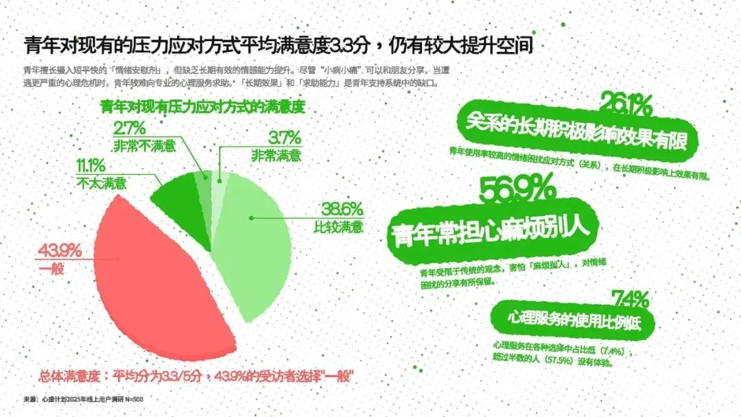 青年对现有的压力应对方式,整体满意度平均为 3.35 分。他们擅长用短平快的方式接住当下的情绪,却也清楚这些方式难以带来长期的情绪能力提升。小病小痛的情绪可以和朋友分享,可当遭遇更严重的心理危机时,很多人依然难以向专业的心理服务求助。59.6% 的青年期待找到真正适合自己的情绪调节方式,56.8% 的人希望减少逃避等短期缓解方式,52.2% 的人想要通过情绪调节提升解决现实问题的能力。他们想要的从来不是彻底消除负面情绪,而是学会和情绪共处,在情绪的起伏里,依然能守住自己的生命力。