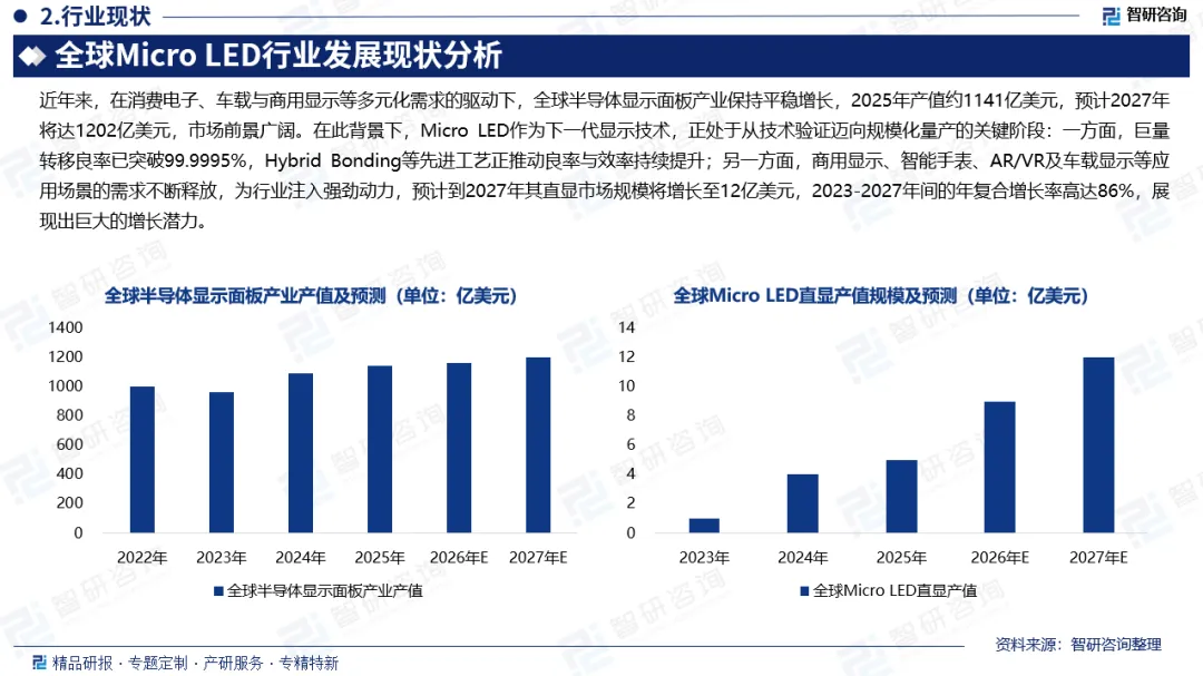 近年来,在下游消费电子、车载显示、商用显示等终端产品的多元化需求驱动下,全球半导体显示面板产业保持平稳增长态势,产业格局持续优化,市场发展潜力充足。据数据统计,2025年全球半导体显示面板产业产值约1141亿美元,行业整体发展稳中向好,预计2027年产业产值将进一步攀升至1202亿美元,未来市场前景广阔。全球Micro LED行业正处于从技术验证向规模化量产迈进的关键发展阶段,市场规模实现快速增长的同时,核心技术突破与成本控制仍是行业发展亟待解决的瓶颈。当前行业技术迭代提速,巨量转移良率已提升至99.9995%,驱动集成、封装技术持续升级,Hybrid Bonding等新兴工艺更是推动产品良率与生产效率双提升,叠加商显、智能手表、车载显示、AR/VR微显示等下游应用场景的需求持续释放,行业增长动力强劲,预计2027年全球Micro LED直显产值将达12亿美元,2023-2027年期间年复合增长率高达86%。