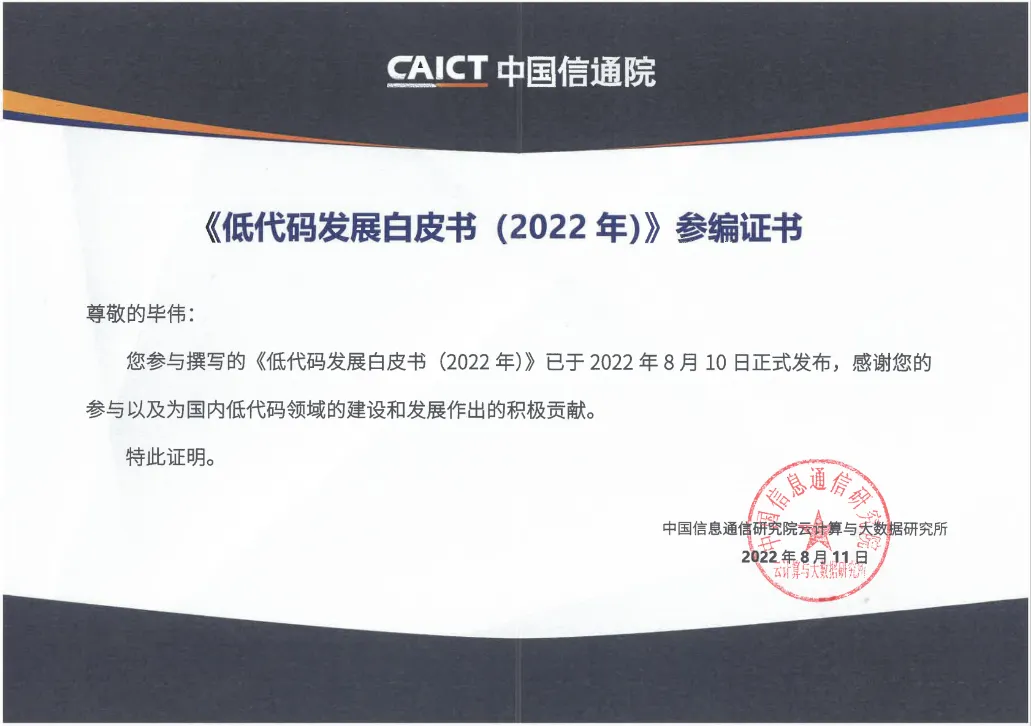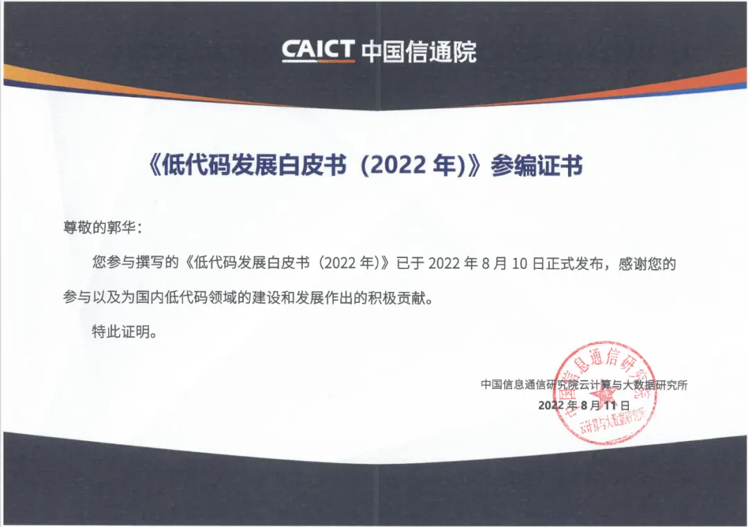 2021年年底,中国信通院开始组建低代码相关工作组,设立在企业数字化发展共建共享平台的数字化可信服务委员会下,远光软件作为国内主流的企业管理、能源互联和社会服务信息技术、产品和服务提供商,荣幸受邀加入其中,由公司总工程师毕伟、信创平台部副总经理郭华作为参编专家代表加入工作组,针对各行业的低代码/无代码产品服务、解决方案开展技术标准、调研报告、性能及兼容性测试、应用成熟度等方面展开研究探讨,并就低代码典型应用场景与低代码发展展望提出了独到、前沿的见解,深度参与《低代码发展白皮书(2022年)》的编制工作,一同为各行业企业开展数字化转型选择可靠可信的低代码技术平台和服务商提供参考指导。