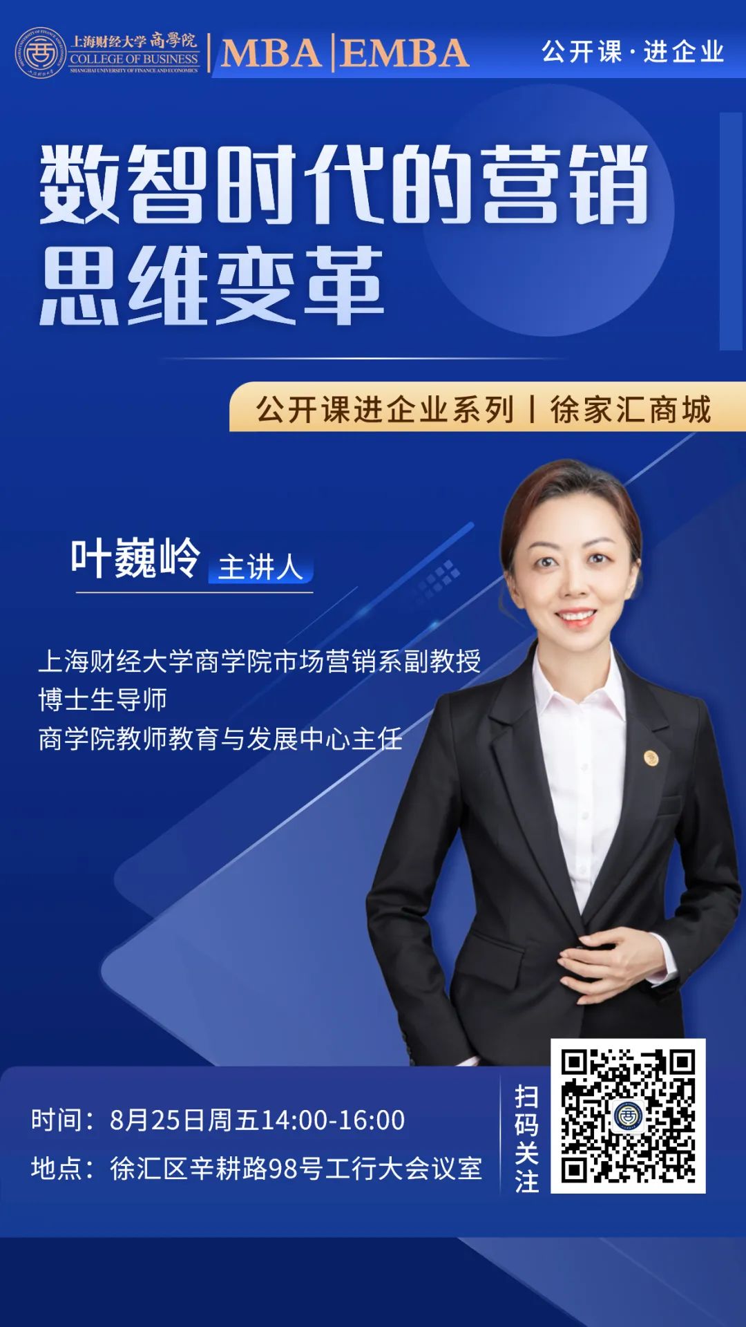 8月25日(周五)14:00-16:00,上海财经大学商学院市场营销系副教授,博士生导师,商学院教师教育与发展中心主任叶巍岭老师将从理论到实践,带领徐家汇商城的企业精英们一起解读数智时代的营销思维变革。
