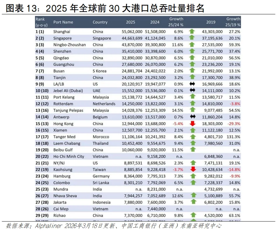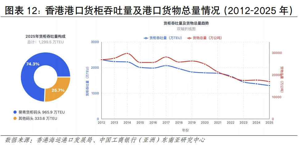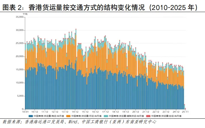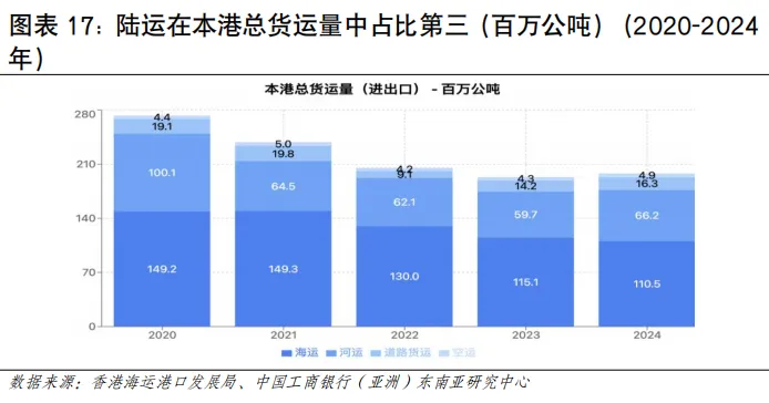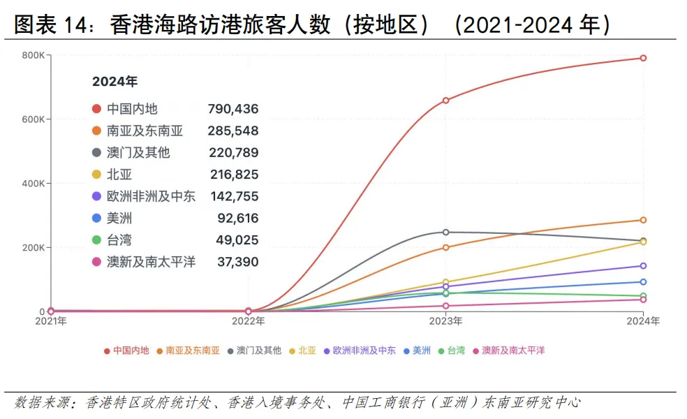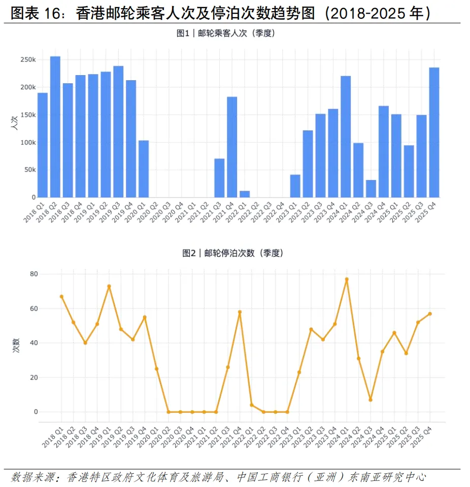 受毗邻港口快速发展等因素影响,近年香港港口集装箱吞吐量呈下滑趋势。2025年,香港港口完成集装箱吞吐量1,299万TEU,同比下降5.1%,其中葵青货柜码头处理了近965.9万TEU,占港口货柜吞吐量约74%(见图表12)。尽管面临运量下滑的压力,香港的独特优势依然突出。其一,作为自由港,香港拥有高效的清关流程和零关税政策,对高价值和时效性要求高的货物(如电子产品、奢侈品、药品)仍具较强吸引力。其二,香港实行普通法法律体系,在海事仲裁、金融和保险服务方面拥有优势,是处理复杂国际贸易和航运纠纷的理想枢纽。从亚太区域来看,全球港口吞吐量(万TEU)排名前15中,中国占7席、上海第1(5,506),新加坡稳居第2(4,466),马来西亚巴生港(1,514)、丹戎帕拉帕斯港(1,403)分别位居第11、第13位,香港位列第15名,越南胡志明市港、盖梅港居第20、28位(见图表13)。区域主要港口各具特点。其中,新加坡港在国际转运业务上具有较强竞争力、清关效率被视为全球“标杆级”水平,韩国釜山港主要服务于本国进出口及东北亚转运,马来西亚港口依托马六甲海峡优势、也是重要中转枢纽,越南港口主要服务于本国进出口,日本主要港口侧重于服务国内经济,珠三角港口群、长三角港口群直航能力增强与智慧化水平持续提升。航运客流规模有望提升,邮轮发展持续向好。2025年香港海路访港旅客约181万人次,占整体出入境总量的3.6%,邮轮乘客占比较高。全球邮轮行业已步入新一轮增长周期。据国际邮轮协会《2025年邮轮业状况》报告,2024年全球邮轮游客超过3,413万人次,全年收益超300亿美元,2027年预计进一步增至4,000万人次。从区域看,亚太地区发展势头最为强劲,未来几年年均增速预期可达19.6%,或成为推动全球邮轮业增长的核心引擎。香港邮轮发展持续向好,根据香港旅游发展局数据,2024年录得约150个邮轮航次,旅客约52万人次;2025年增至189个航次,旅客约63万人次,同比实现双位数增长。2026年首两个月已迎来52个航次、旅客超18万人次,接近上年全年约三成水平,全年总量有望再创新(见图表14)。海运出境居民人流占比较低。疫情后海运人流积极恢复,2023年本港居民通过海运出境247万人次,较2022年的4,906人次增502倍;2024年海路出境居民约236万人次,同比下降5%,通过海路出境的居民人次仅占本港居民整体出境人次的2.3%(见图表15)。2. 邮轮客流呈现出亚洲邮轮为主、海外度假为主、短途航线为主的特征。具体看,其一,航线以亚洲区域为主,邮轮航线主要往返新加坡、日本、韩国、越南等亚洲目的地,近年来亦吸引皇家加勒比、丽星邮轮等国际品牌以香港为母港运营短途航线;其二,旅客以度假为主要目的,2024年经启德邮轮码头出入境的旅客中,海外访客占40%、香港居民占30%、内地旅客占30%;其三,以短途航线为主,运行时间多为3-5天,如香港至三亚、香港至越南等航线(见图表16)。陆地运输发展情况