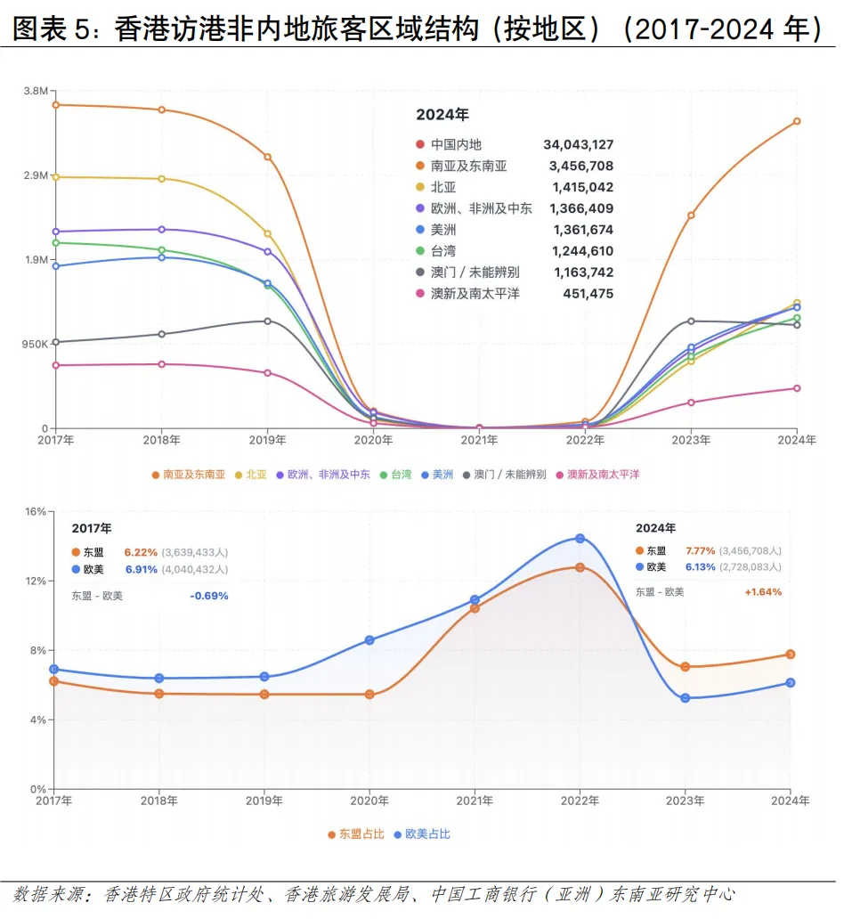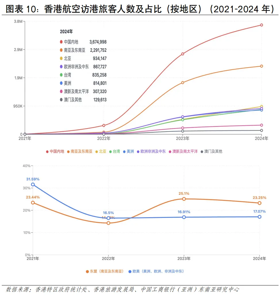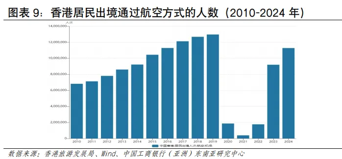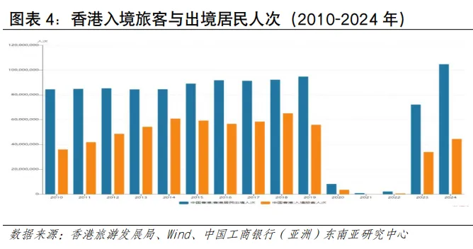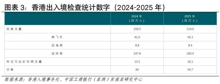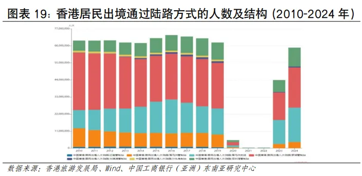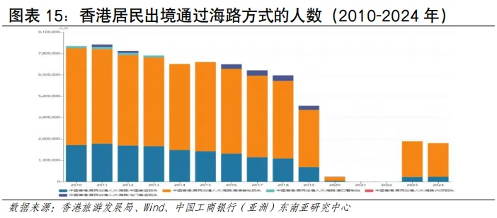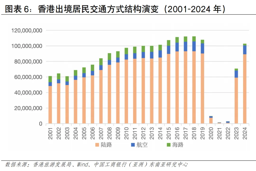 从人流规模看,近年香港人流增幅在亚太地区处于领先地位。根据香港入境事务处数据,2024年香港出入境总人次约2.98亿,同比增长约41%,2025年香港出入境总人次约3.35亿,同比增长12%(见图表3)。从入境人流看,访港旅客数量在强劲复苏,内地旅客是入境主力。2024年录得访港人数4,450万人次,其中内地访客入境香港人次约3,404万,同比增长约27%;其他访客入境人次约1,046万,同比增长约44%。2025年访港旅客入境总人次约4,989万人,按年上升12%,其中有3,783万访港旅客人次来自中国内地,同比增加约11%,占全年访港旅客量76%。访客增速远高于全球平均水平,反映香港作为国际旅游枢纽的强大吸引力和本港居民出游意愿的提升。从出境人流看,香港居民出境人数远超入境旅客,反映本地居民出境意愿更强烈,香港与内地形成了大规模高频次的双向通勤与消费模式是重要的影响因素。根据香港旅游发展局统计及入境事务处统计数据估算,2025年香港居民出境人次超1.17亿,同比增长12.3%,2025年香港居民经陆路(除港珠澳大桥外)赴内地人次约为9,306.7万,按年增长14%。其中,经高铁出境724.3万人次,按年上升15.5%;经其他陆路口岸赴内地约8,582.4万人次,按年上升13.9%。香港居民出境已常态化,“北上”消费、工作、养老等需求持续增长。2025年主要公共假期期间,赴内地人次均保持高位,如春节期间约226万、复活节期间约213万、圣诞节期间约152万以及清明节期间约82万,多个假期按年增长超过10%[2]。从入境旅客国别结构看,东盟地区访客占比呈上升趋势。2025年访港非内地旅客约1,210万人次,同比增长15%,占总旅客量24%。其中,中国台湾、日本、越南、澳大利亚和中东地区的增长尤为强劲,按年增幅均达25%或以上;菲律宾、泰国、越南和印度等短途市场也已经恢复或超越疫情前水平。从地区看,东盟访客占比从2019年的6.2%上升至2024年的7.7%,欧美访客占比从2019年的6.9%下降至2024年的6.1%东盟旅客已超越2019年水平(113%),而欧美仅恢复75%,东南亚客源的强劲增长正在重塑香港旅游市场格局(见图表5)。从跨境交通方式看,出入港人流且呈现陆路为主、空运次之、海运最少的特点。从访港旅客看,2025年访港旅客中,通过机场管制站的访港旅客约有1,122万人次,占全年访港旅客总量的逾五分之一;通过海路管制站入境约181万人次,有效补充了香港与内地沿海城市及澳门之间的多元化交通网络,满足了特定区域和旅游观光客流的出行需求;陆路口岸是香港出入境人流的绝对主体,承载着与内地,特别是粤港澳大湾区深度融合产生的高频次、大规模人员往来。2025年全年,香港所有口岸的出入境总人次达到约3.35亿,较2024年增加约12%,不仅超越了疫情前水平,更创下有纪录以来的新高。其中通过陆路管制站入境的访港旅客高达3,687万人次,占所有访港旅客的七成以上,来往内地的车辆带动出入境1,810万人次。从出境人流看,2024年航空、海路、陆路的占比分别为10.8%、2.3%、85.2%,其中陆路占据主导比例,2024年香港居民通过陆路出境近9,000万人次(见图表6)。航空运输发展情况