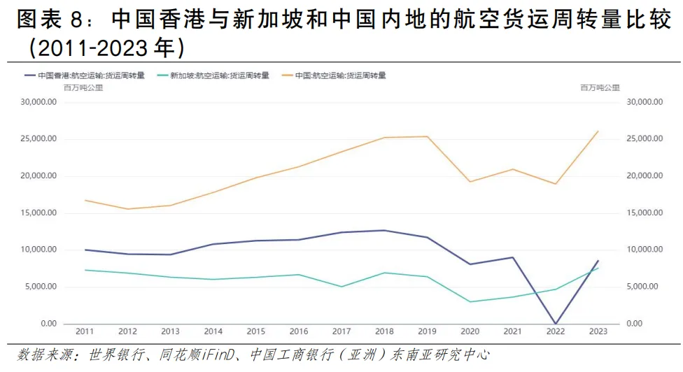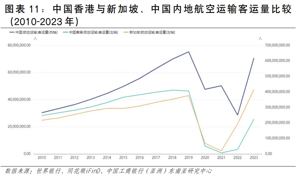 (二)航空人流:人流吞吐量与访港旅客数量齐升,客群国际化特征明显近年来香港航空客流增速领先全球。客运市场稳步复苏,2023年旅客吞吐量恢复至疫情前约70%,国际中转客流是重要组成部分。2024年香港机场累计完成旅客吞吐量5312.1万人次,同比增长34.3%;2025年全年客运量录得双位数增长,达6,100万人次,较去年上升15%。2025年机场管制站的访港旅客约1,122万人次,同比增长约12%。增长的驱动力看主要包括三个方面:一是国际商务客流的恢复,二是旅游客流的增加,三是中转客流的增加。航空出境居民人数疫情后快速反弹。疫情下香港居民出境人数骤减,疫情后触底反弹,2023年香港居民通过航空出境约920万人次,较前年增长超过420%;2024年航空出境本港居民1,128万人次,同比增长22.6%。航空出境约占整体出境居民人次的10.8%(见图表9)。空运客源地具有明显的国际化特征。其一,中国内地仍是最大客源地,占比37%;其二,东盟地区的客流占比呈上升趋势,年均增长率约为15%;其三,欧美地区的客流占比呈下降趋势(见图表10)。香港空运人流特征:其一,中转客流占比较高,疫情前占比近30%,目前正力争恢复至这一水平,2026年1-2月,转机及过境旅客量同比大幅攀升30%,呈现强劲恢复势头,在全球主要机场中处于较高位置;其二,旅游客流呈季节性波动,春节期间为明显客流高峰(如2026年2月峰值单日超21万人次),夏季亦为传统旺季。从亚太区域来看,香港的航空客运量走势与新加坡高度相似。新加坡作为东南亚核心国际航空枢纽,2023年航空客运量达4,750万人,恢复势头良好;香港依托国际化航空网络,2023年航空客运量达2,570万人,客运市场持续修复中;中国内地航空客运市场规模庞大,受疫情影响2020年至2022年有所回落,2023年强势反弹至6.2亿人(见图表11)。海上运输发展情况