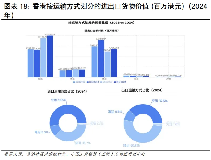 从货运量角度看,近年香港陆路货运量经历波动后呈现稳步复苏态势,整体占比较小。数据显示,香港的公路货运量在2022年曾因疫情相关管控措施影响而大幅下跌,但随后迅速反弹。2024年香港总货运量19,790万吨,其中经陆路运输的货物总量为1,630万吨,占比8.4%(见图表17)。从货运价值看,陆路运输增长动力正从传统贸易向跨境电商驱动的快速高增值配送服务转型,货值占比近半。从运输货物的价值来看,2024年香港的陆路运输出口货值为2.3万亿港元,同期香港整体货物出口运量总值为4.5万亿港元,陆运占比约50.9%,货值同比增长21.0%。在跨境电商蓬勃发展的推动下,香港本地快递和跨境直邮服务迎来了爆发式增长,催生了一批专注于跨境电商物流的本地企业。香港陆路物流业正从传统大宗货柜转运,向依托航空枢纽的高价值货物、跨境电商物流以及服务大湾区的多式联运等高增值方向转型(见图表18)。在传统陆路转运方面,粤港澳大湾区内各城市形成了功能互补的物流格局。深圳依托盐田港的国际班轮直靠能力,广州凭借南沙港与广阔产业腹地的联动优势,国际连接能力持续增强,叠加内地海关与检验检疫效率的提升,有效拓展了港口腹地辐射范围;香港则发挥自由港政策、高效通关及成熟的国际贸易服务网络优势,在高附加值货物中转与国际物流协调方面持续发挥重要作用。三地在陆路货运领域各有侧重,协同效应日益显现。