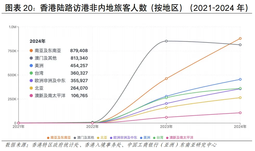 陆路人流是香港出入境人流的绝对主体,2025年陆路管制站入境旅客约3,687万人次,占总访港旅客入境人次的74%,内地访客占90%,这一比例在全球主要城市中处于较高水平,反映了“宜居宜业宜游”的一体化湾区建设持续取得新成效。陆路交通是香港居民出境的主要方式。2023年陆路出境居民约5,910万人次,快速恢复至2005年的水平,较2022年增长58.77倍;2024年陆路出境本港居民约8,924万人次,同比增长51%,恢复至2019年水平。2024年陆路出境居民人次占本港总体出境居民人次的85.2%,表明陆路是居民出境的主要渠道(见图表19)。2025年全年,深圳出入境边防检查总站累计查验出入境人员2.74亿人次,全年日均查验74万人次、单日最高达109.4万人次。其中,落马洲—皇岗口岸日均人流量最高可达33万人次,该口岸的人流构成多元,包括高铁乘客、巴士乘客、步行过关的游客等。深圳湾口岸是连接深港西部的重要交通枢纽和跨境通道,日均人流量最高达20万人次,主要以自驾车和巴士乘客为主。陆路人流以中国内地访客占比最多。根据香港入境事务处数据,2024年通过陆路口岸入境香港的访客总计约3,281万人次,其中,中国内地访客占比高达90%。来自广东省的访客增长较快,自2024年12月起,深圳恢复“一签多行”政策,显著带动跨境旅游需求,截至2025年11月初,持该签注赴港人数同比增长22%,累计签发141.7万证次,反映了大湾区一体化建设的推进和内地消费升级的驱动。陆路客流的非内地旅客中,南亚及东南亚旅客占比最高,其次是中国澳门、美洲和欧洲、非洲及中东旅客(见图表20)。