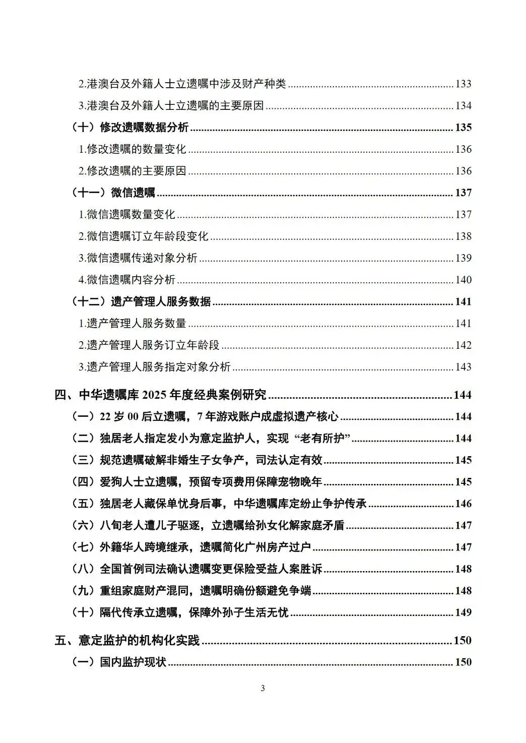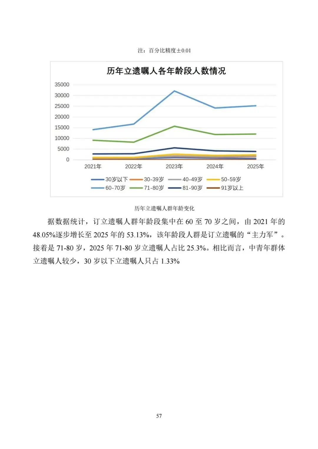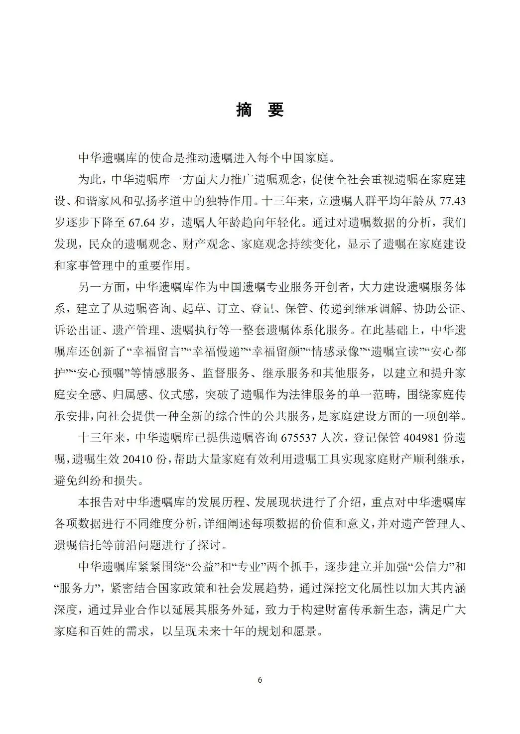 遗嘱作为家庭财产传承的重要法律工具,其规范化、专业化服务对于维护家庭和谐、保障公民财产权益具有深远意义。本报告基于中华遗嘱库2013年至2025年的运营数据与实践案例,系统梳理了我国遗嘱服务的现状、人群需求特征及行业发展趋势。数据显示,遗嘱订立人群结构呈现多元化,中青年立遗嘱比例显著上升,遗嘱内容涉及财产类型日益复杂,反映出公众遗产规划意识的普遍增强。同时,遗产管理人制度的落地与实践,为解决遗产继承纠纷提供了新的法律路径。报告还深入分析了遗嘱服务在化解家庭矛盾、定向传承财富、支持公益慈善等方面的社会价值,并对行业标准化、专业化发展提出了前瞻性思考。本研究成果旨在为相关法律法规完善、公共服务优化及社会观念引导提供数据支撑与决策参考。