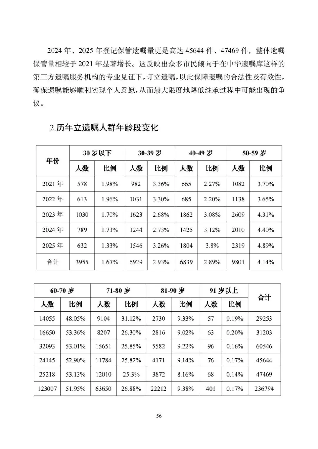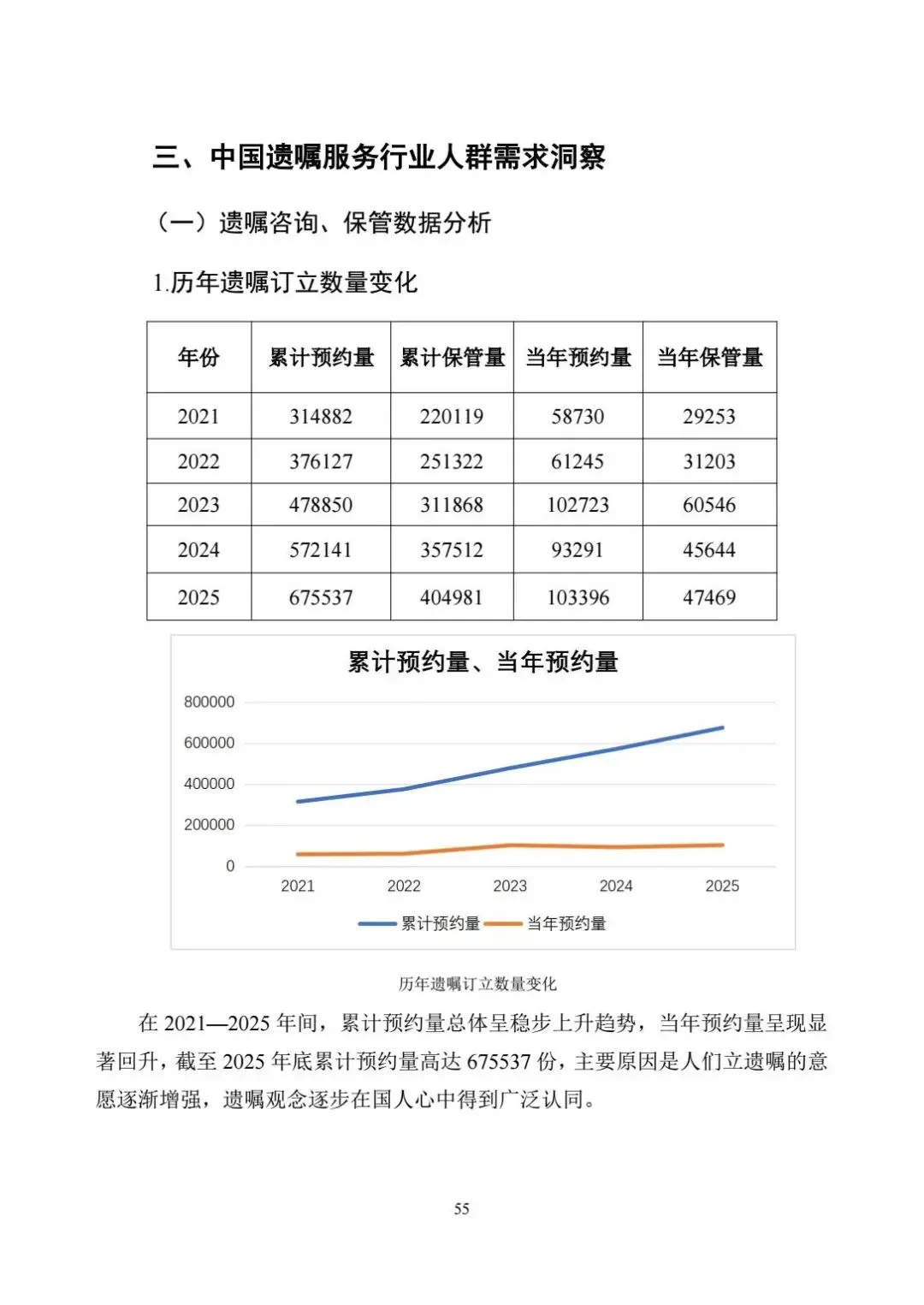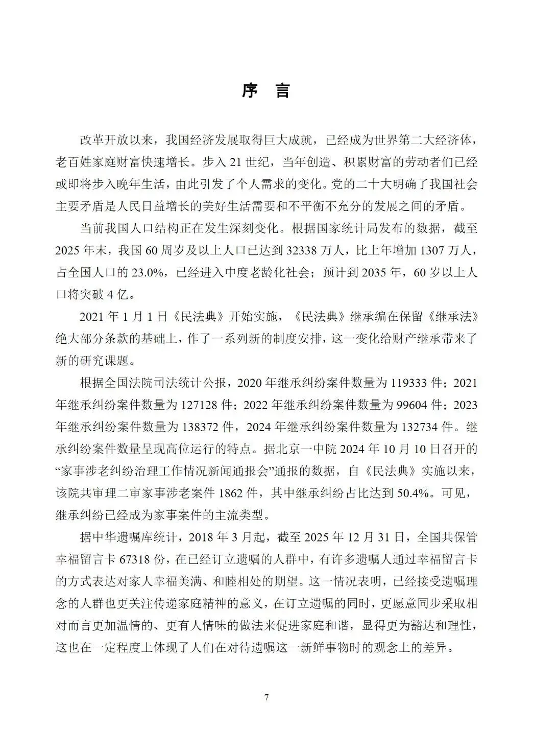 遗嘱作为家庭财产传承的重要法律工具,其规范化、专业化服务对于维护家庭和谐、保障公民财产权益具有深远意义。本报告基于中华遗嘱库2013年至2025年的运营数据与实践案例,系统梳理了我国遗嘱服务的现状、人群需求特征及行业发展趋势。数据显示,遗嘱订立人群结构呈现多元化,中青年立遗嘱比例显著上升,遗嘱内容涉及财产类型日益复杂,反映出公众遗产规划意识的普遍增强。同时,遗产管理人制度的落地与实践,为解决遗产继承纠纷提供了新的法律路径。报告还深入分析了遗嘱服务在化解家庭矛盾、定向传承财富、支持公益慈善等方面的社会价值,并对行业标准化、专业化发展提出了前瞻性思考。本研究成果旨在为相关法律法规完善、公共服务优化及社会观念引导提供数据支撑与决策参考。