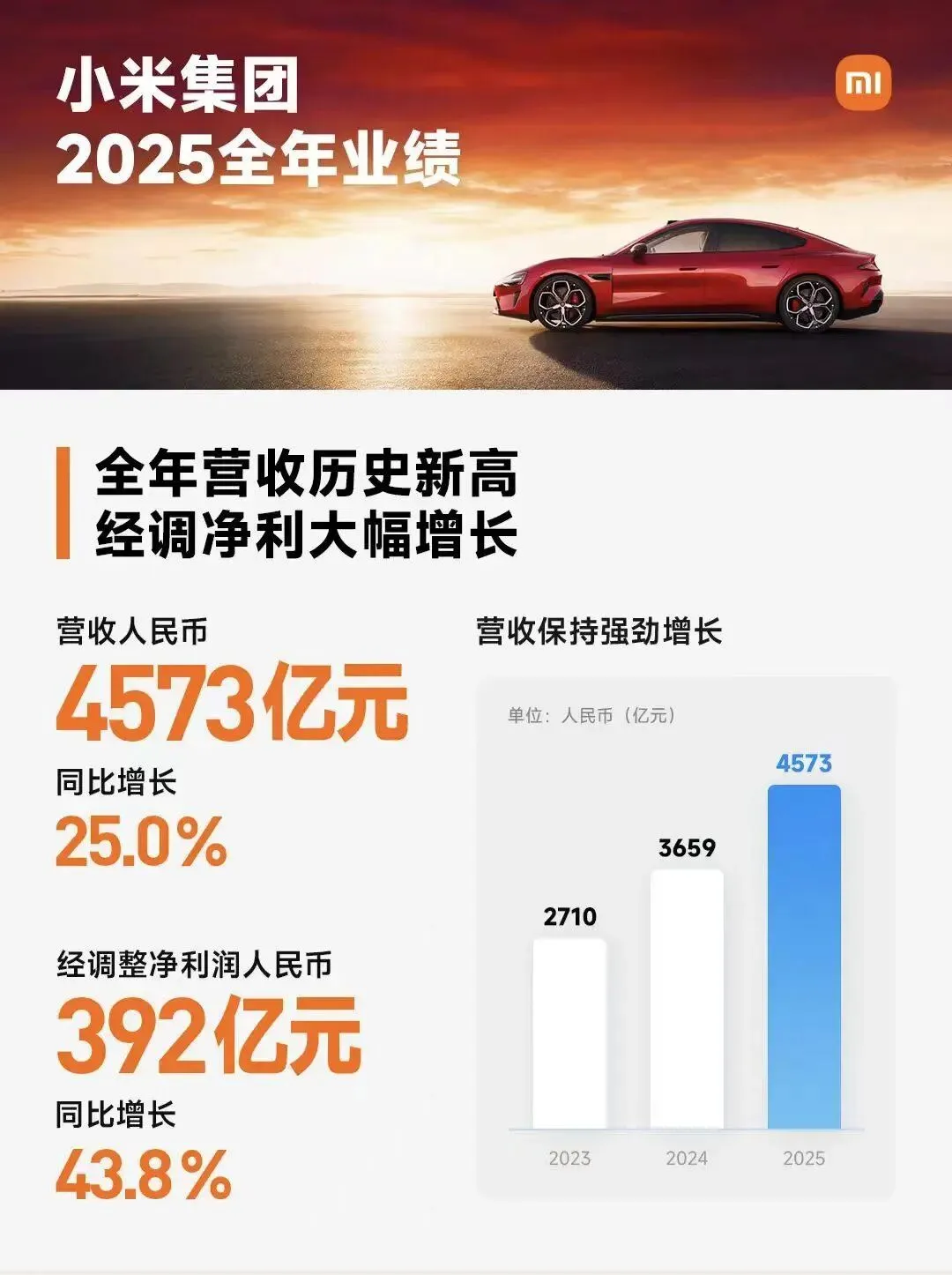 近日,小米集团2025年财报数据出来了,全年营收4573亿元,同比增长25.0%;净利润392亿元,同比增长43.8%。