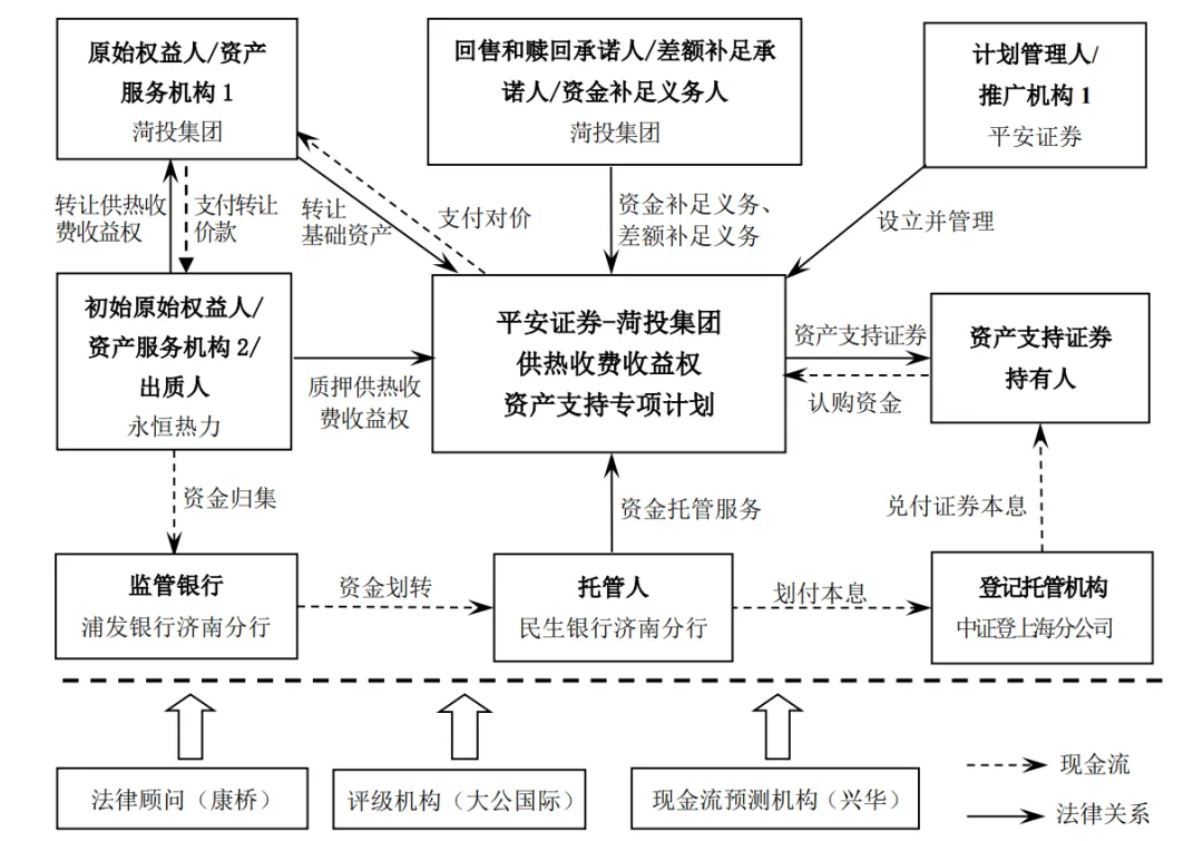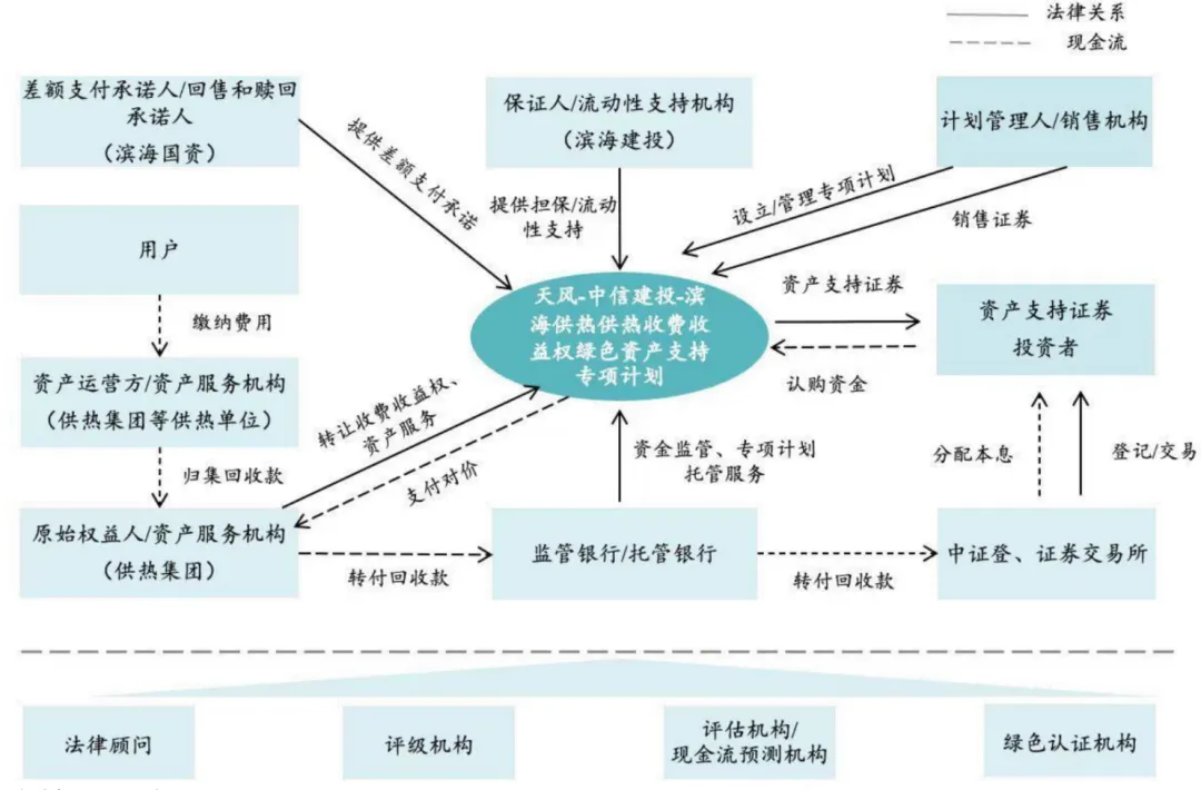 清洁供热企业通常将其在未来某一特定期间内、对某些特定用户的供热收费收益权作为基础资产,以其产生的现金流为偿付支持,通过高评级主体外部增信等、资产抵质押方式,发行资产支持证券进行融资,从而实现未来供热收费的提前变现。资产支持证券的投资者通常包括银行以及证券公司、基金公司、保险公司等非银金融机构。