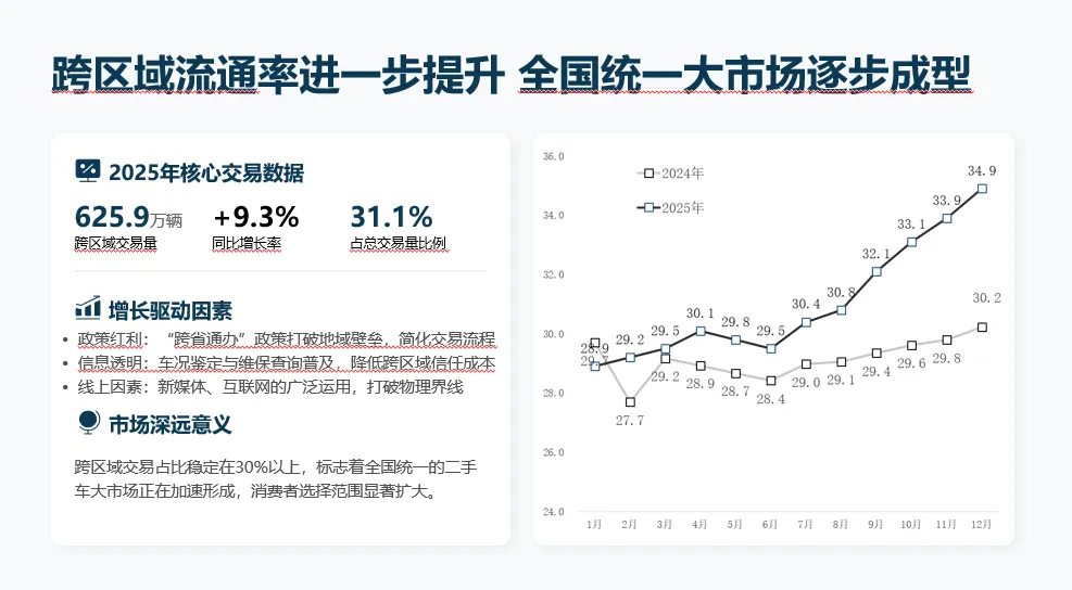 罗磊表示,受益于国五全国流通、跨省通办政策、检测报告的普及和直播电商的推动,跨区域流通明显增长。此外,二手车需求正从一线城市向下沉市场转移。为应对新车价格波动风险,二手车商主动加快周转,平均库存周期下降明显。