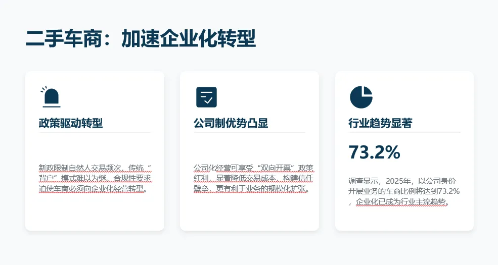 政策引导下,二手车从业者正从"车贩子"式的个体户向企业化转型,受访车商中企业化比例已达73.2%。市场出现明显洗牌,中等规模车商经营最困难,而头部车商和连锁化品牌规模增长迅速。头部二手车经销商开始重视售后服务,售后收入增长显著,一些车商开始走品牌化、差异化路线。
