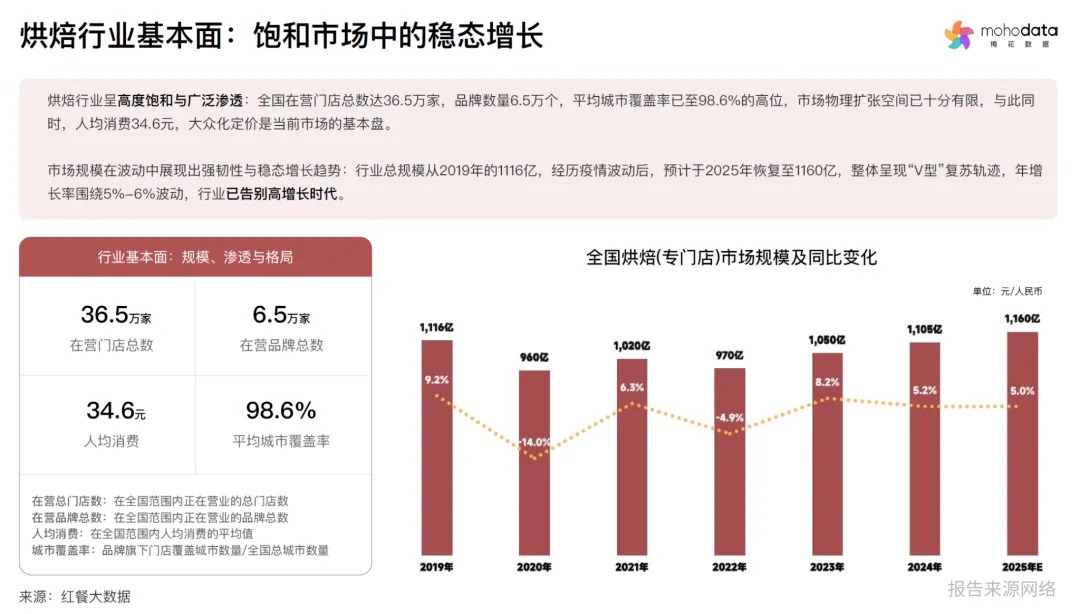 梅花数据《2025年烘焙行业品类洞察与消费者心智研究报告》显示,烘焙行业正站在新旧迭代的关键节点:一边是36.5万家在营门店、98.6%城市覆盖率的高度饱和格局,一边是健康化、本土化、功能化的消费新需求持续升级。