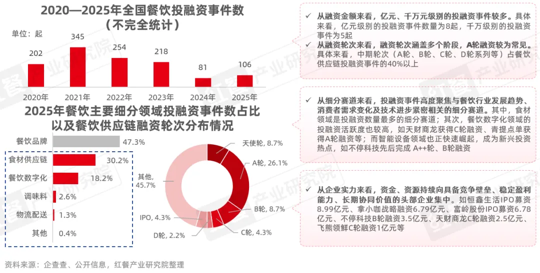 据红餐产业研究院不完全统计,2025年全国餐饮产业共发生投融资事件106起,相较2024年同比增长30.9%,这表明2025年餐饮投融资正在温和复苏。