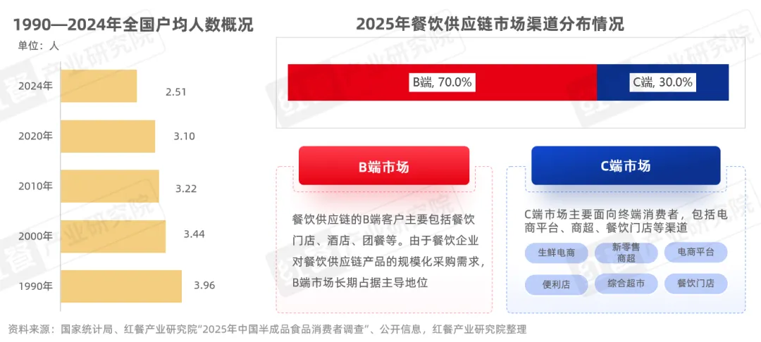 近三十余年,随着全国户均人数持续下降,2024年我国户均人口降至2.51人。在小家庭及独居群体逐渐增多的单身经济浪潮下,消费者尤其是年轻群体和单身人士,对便捷、快速的就餐需求持续增加。