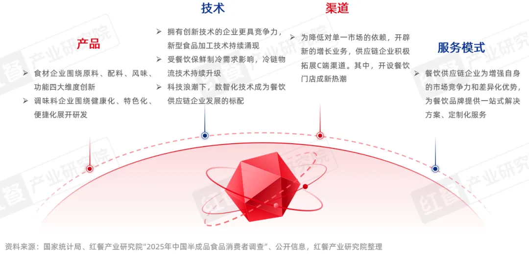 随着下游餐饮市场的竞争进一步加剧,品牌对上游供应链的要求越来越高,为提高自身竞争壁垒、增强客户黏性,餐饮供应链企业也在不断优化和创新,以更具差异化的产品、更灵活的服务模式、更快的响应速度,支撑下游餐饮行业的连锁化扩张。据红餐产业研究院观察,餐饮供应链企业主要在产品、技术、渠道、服务模式等维度上创新。