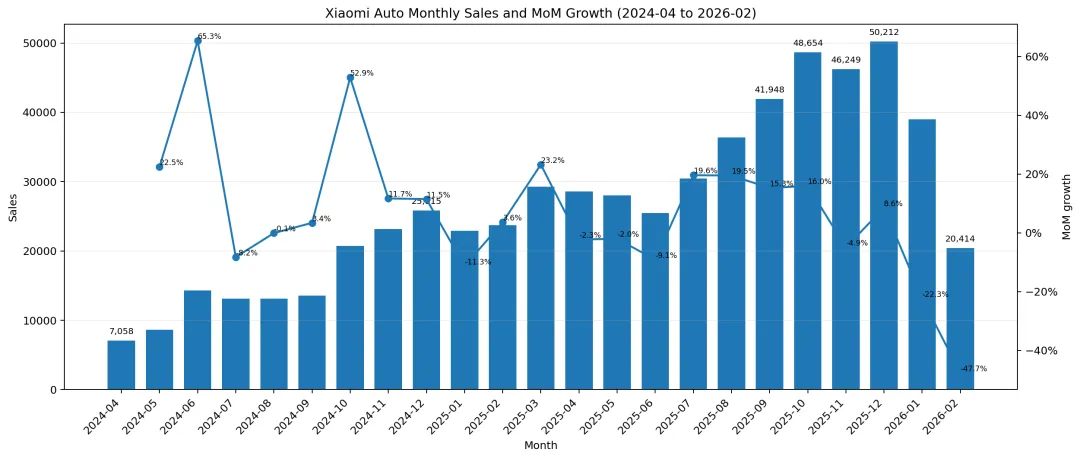 从单月销售数据来看,2024-2025增长强劲,2025全年完成41万辆交付。雷总给的2026年交付目标是55万辆,虽然今年1-2月行业整体由于高基数和政策不确定性产生需求滞后,但目前来看完成目标或许问题不大。