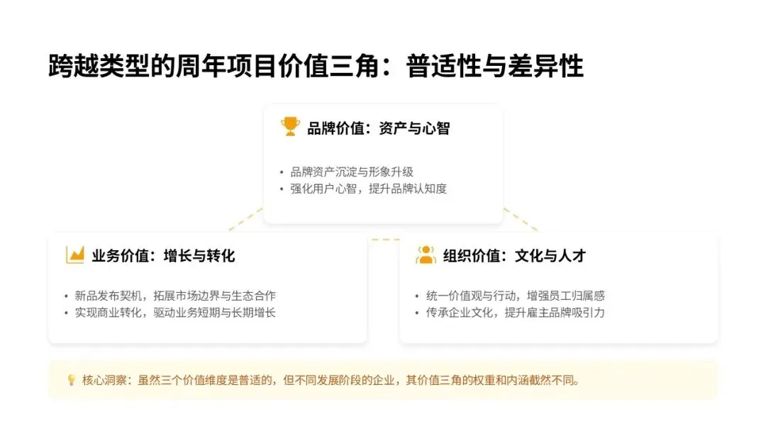 书里有一个很重要的观察:不同发展阶段的企业,在品牌、业务、组织这三个维度上的重点,并不相同。换句话说,周年庆不是每次都要“面面俱到”。这个认知我认为很重要,因为它会把“做活动”的思路,拉回到“判断价值重心”的层面。