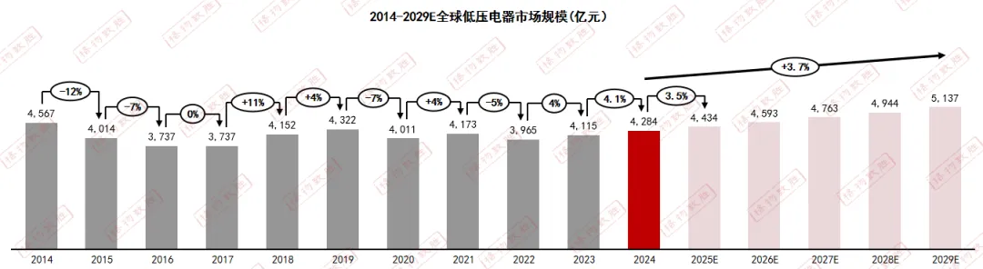 2024年全球低压电器市场规模达到4284亿元,同比增长4.1%,北美、欧洲、东南亚等区域助力明显。且随着全球经济复苏、行业适配新兴领域需求(如新能源配套、智能电网建设)的产品技术成熟,预计未来复合增长率相对平稳。