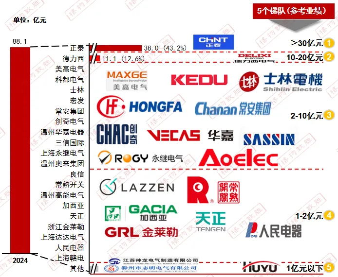 市场格局来看,第一梯队的正泰市场规模超过30亿元,第二梯队的德力西市场规模11亿元,其他梯队企业业绩规模均在10亿元以下。