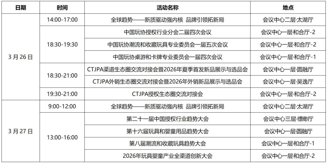 3月26日上午,班车发车时间为8:00,参加中国玩具和婴童用品协会第九次会员代表大会的嘉宾请乘坐此班次班车前往会场。