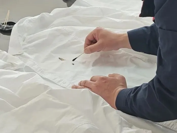 为最大限度还原消费者日常穿着场景下衣物产生的污渍类型与损耗状态,确保试验场景的真实性、评测指标的科学性,本次比较试验前期联合省洗染行业协会专家团队,对统一采购的试验样品开展5处人工造损处理,具体操作如下: