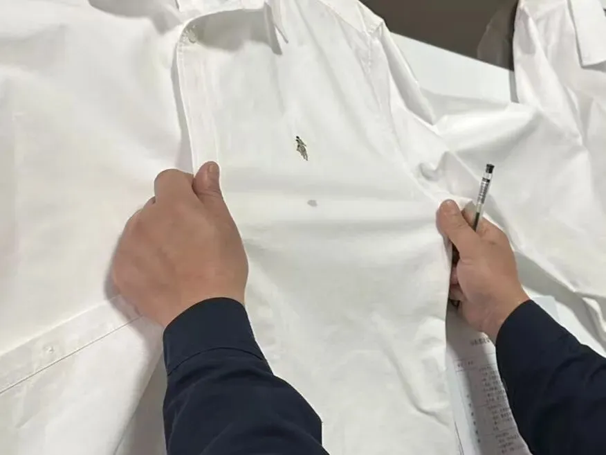 (二)复刻纽扣脱落和破损变形。通过专业工具对衬衫领口、衣襟处部位纽扣进行2处摘除和磨损处理,模拟纽扣长期使用过程中出现的脱落、破损变形等自然损耗状态,重点检验洗衣店在衣物接收时的破损核查能力,以及洗涤、熨烫过程中的细节防护水平。