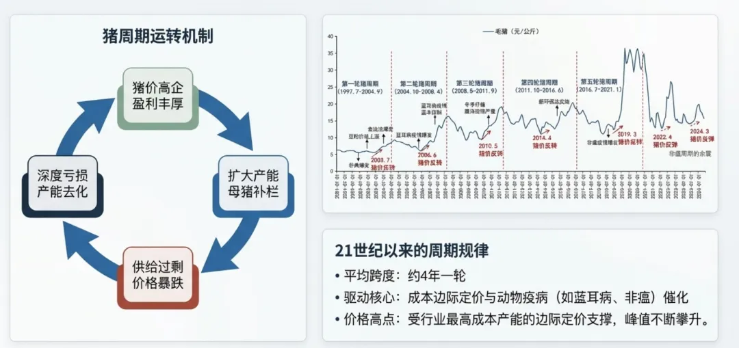 2024年是余震结束, 2025年将是新周期的起点,预期全年生猪均价在13-14元/公斤。 未来的竞争将从“扩规模”转向“提效率”,行业将形成“大型企业管育种/种猪、家庭农场管育肥”的精密分工。进入2026年,现在生猪价格已经创出新低,跌破10元/公斤,后续是否进入行业整体亏损,周期反转需要多久,还需确认。穿越周期,本质上是成本管理与人性的较量。请记住这三条行业金句:- “周期永远存在,但时间正在拉长”:随着规模化提升,周期可能从4年拉长至6-7年(参考美国模式),波动依然剧烈。