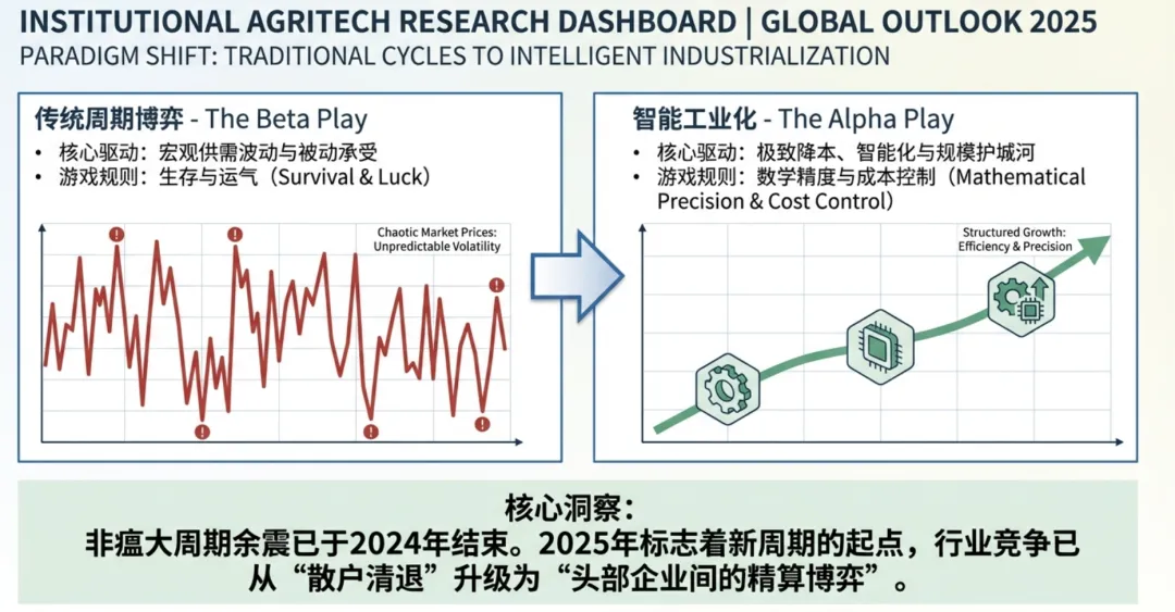 - “成本是唯一的护城河”:规模企业的硬指标是 PSY(每头母猪每年提供的断奶仔猪数)达到25头 (行业平均不足20头),以及 料肉比(Feed-to-Meat Ratio)维持在2.5-2.6 (中小企业通常在2.8-3.0)。