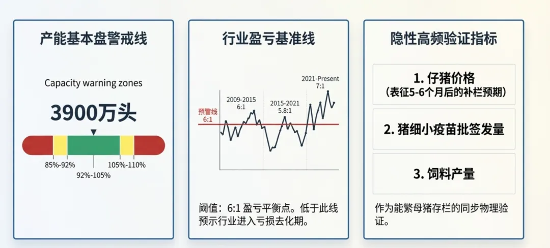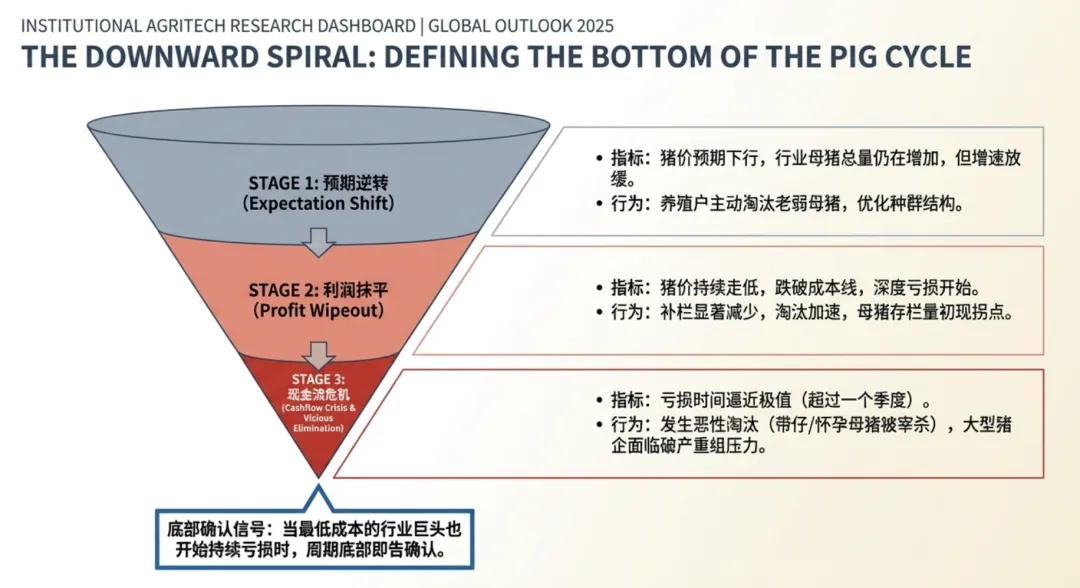 这些指标如何指挥养殖户的行为?我们需要看懂价格背后的“生物钟”。为什么猪价涨了,供应不能马上跟上?因为“二师兄”的生长需要时间。价格作为指挥棒,通过以下两个前瞻指标在跳舞:从母猪怀孕(4个月)到仔猪出栏(6个月),加上哺乳期,你今天看到的母猪数量,决定的是一年后的餐桌供应。这是一个中短期指标。如果现在的仔猪出生量激增,那么半年后,市场必然迎来供应高峰。这里有一个扎心的逻辑: 当价格最高峰时,养殖户往往疯狂补栏;但等这些猪长成出栏时,市场早已过剩。这就引出了一个关于“黎明前黑暗”的深度课题:产能是如何在绝望中出清的?当行业进入下行期,亏损会像多米诺骨牌一样传导。傅真等资深分析师将产能减少分为三个典型阶段:猪价尚在高位或微利,但聪明人已经预见到风暴。此时,养殖户开始“去弱留强”,淘汰产仔数低、年龄大的老母猪。 记住:此时母猪总数可能在降,但生产效率反而可能提升。猪价跌破成本线,亏损持续1-2个月。养殖户开始动真格,不再留后备母猪,行业能繁母猪存栏出现真正的统计学拐点。这是最惨烈的时候。由于长期亏损,全行业 资产负债率已逼近70%的历史高位 (2024年三季度平均水平)。当现金流断裂,养殖场不得不杀掉正在怀孕的母猪(带胎母猪),甚至是规模场(如曾经的傲农、天邦)出现债务违约。核心洞察: 紧盯着“猪王”牧原股份。即便它2024年利润暴增519%,但身上仍背负着 1101亿的巨额负债 。当强如牧原这样的成本领先者也出现季度性亏损时,说明市场已经跌无可跌,最后的一块遮羞布已被撕掉。想在周期中活下来并获利,你需要一套“底部探测工具包”。屠宰场收到的母猪比例异常升高,且出现大量怀胎母猪。牧原等一线企业的单季度亏损,是周期见底的“终极哨音”。这是一个极度有效的直觉指标:当“仔猪价格低于毛猪价格”时,说明养殖户对半年后的市场彻底丧失信心,连苗都不敢抓了。此时,往往就是周期的冰点。- [ 查看官方的“猪细小病毒疫苗”批签发量。如果这种保护母猪产仔的疫苗销量大跌,说明母猪存栏是真的干枯了。